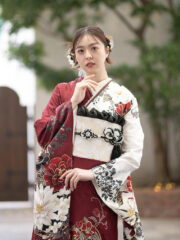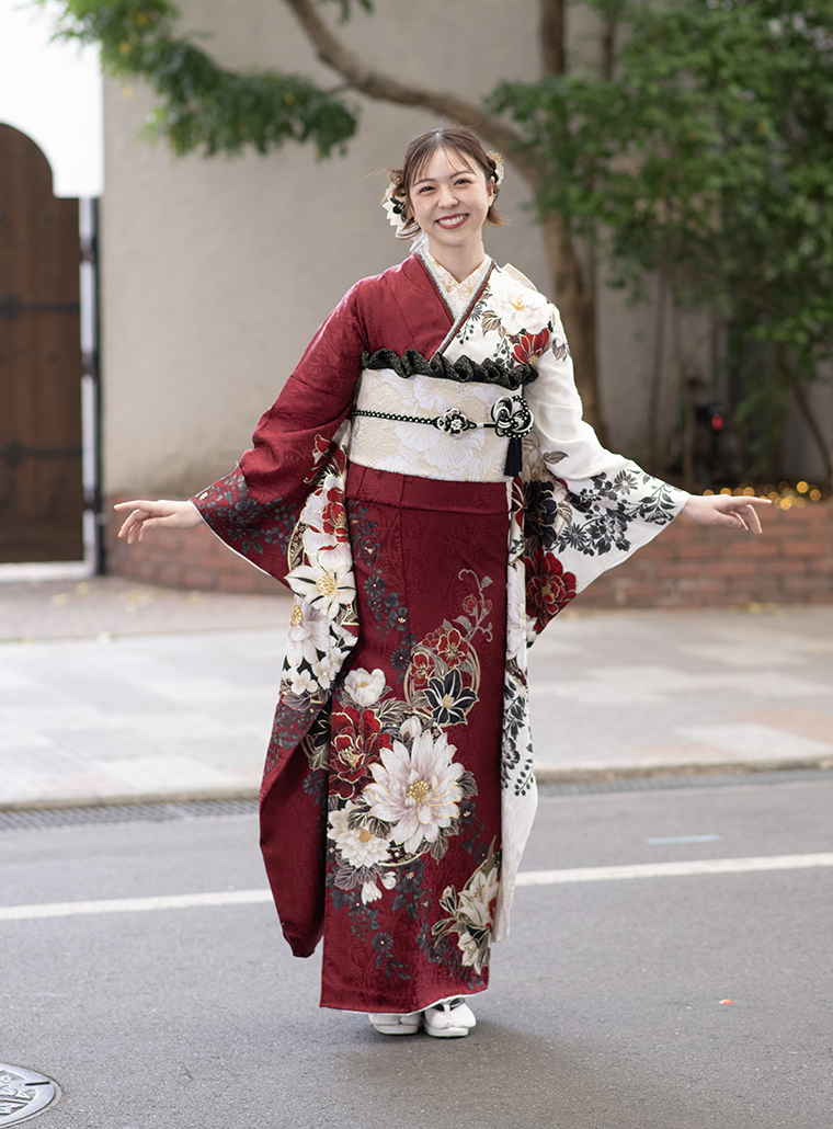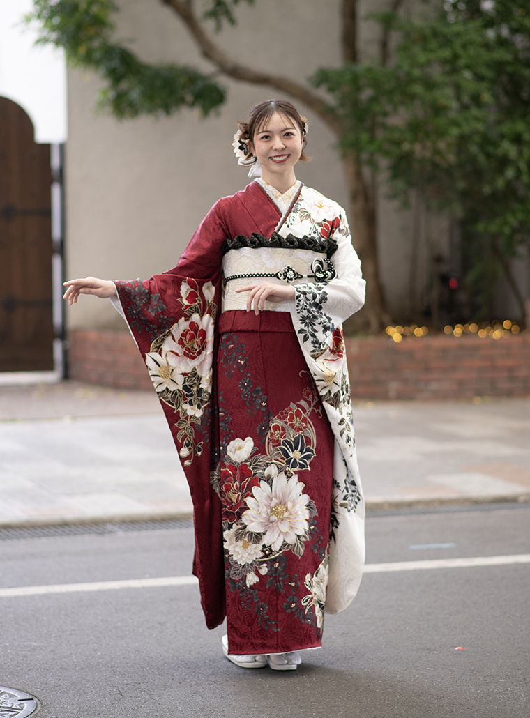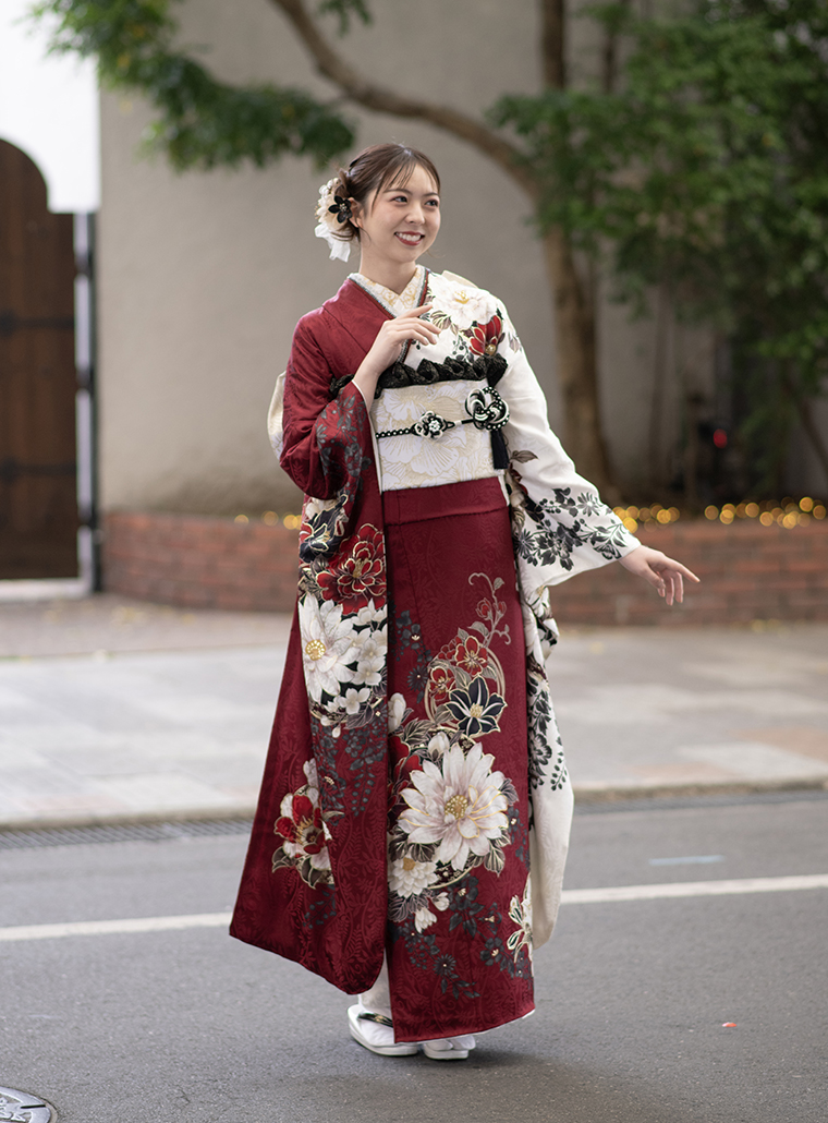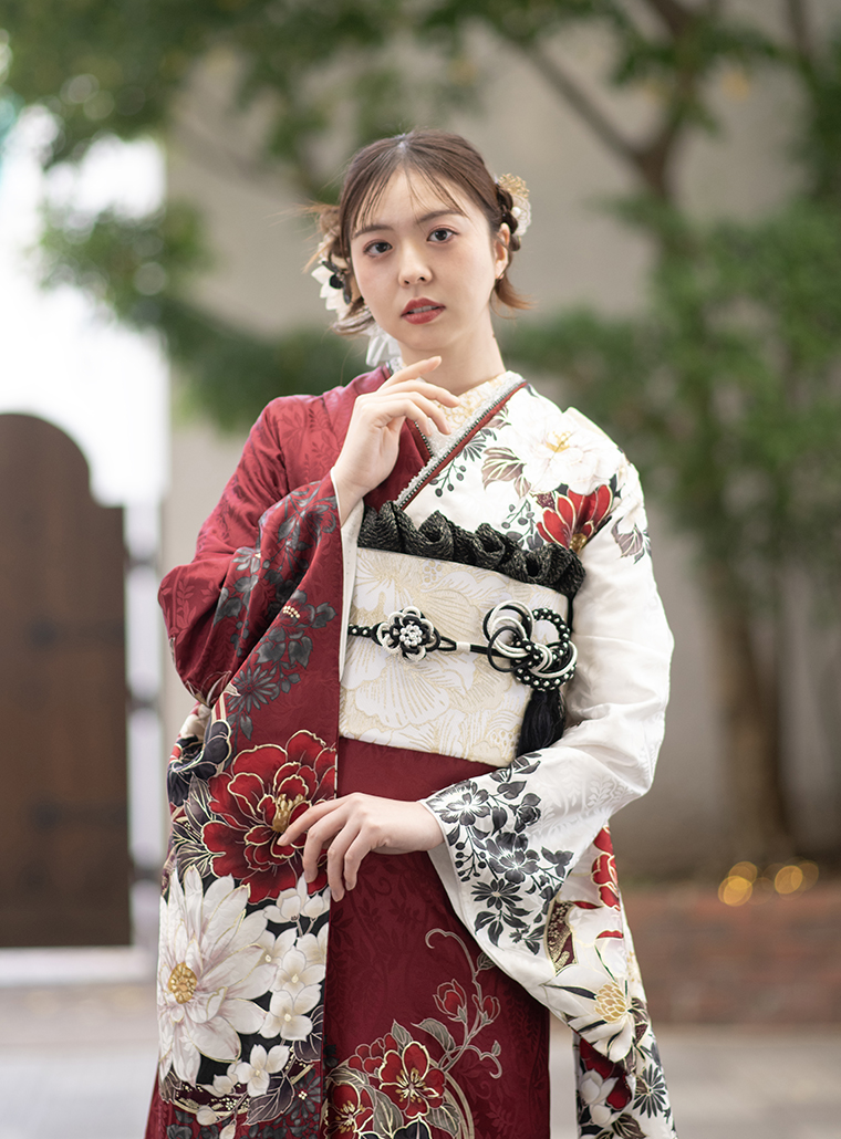 前のスタイル 次のスタイル 商品名称&コード d02603 価格 フルセットお買上げ価格418,000円(税込) オーダーレンタル価格275,000円(税込) Point エンジと白の片身変わりが個性的。赤白黒の花々がクールな美しさを引き立てます。 前のスタイル 次のスタイル